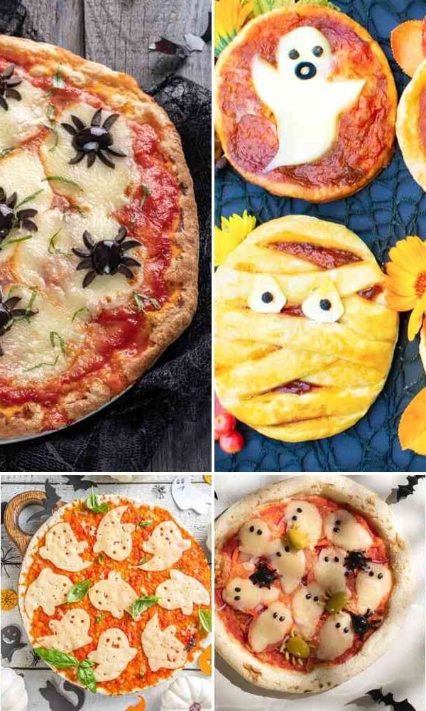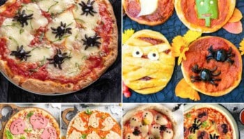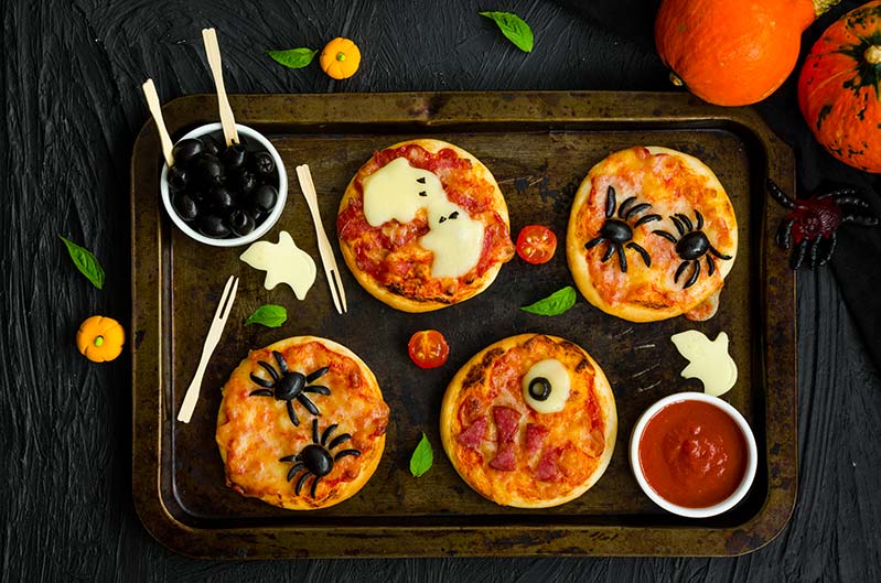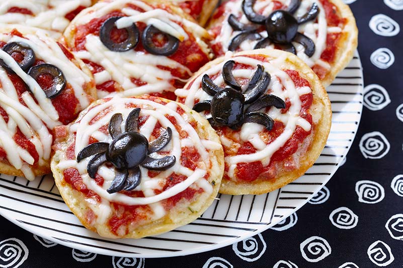 Usad nuestra receta de masa de pizza casera para hacer mini pizzas como estas, así podrás decorarlas con diferentes motivos: ojos y fantasmas de queso, arañas de aceitunas negras…