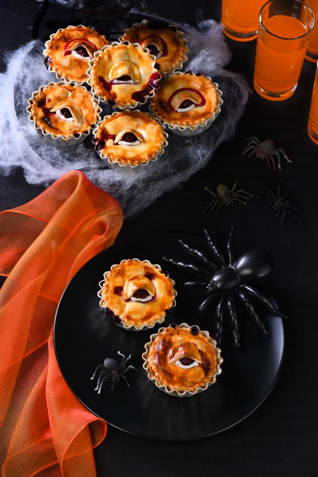 Un pastel salado, por ejemplo este pastel de pollo, puede resultar muy inquietante si lo decoramos del siguiente modo: cortamos unos semicírculos de la masa quebrada o masa de hojaldre que usamos para el pastel, colocamos sobre la masa una ciruela pasa, la cubrimos por la mitad con el semicírculo de masa pegándolo bien y horneamos. Antes de servir hacemos una línea con mayonesa debajo de cada ojo.