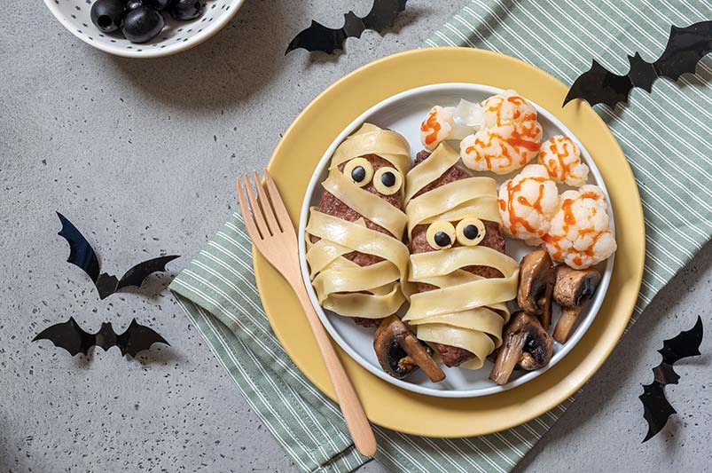 Una salchicha o una hamburguesa se transforma en una momia si la envolvemos con tagliatelle cocidas. ¿Y qué os parecen las coliflores al vapor que parecen cerebros gracias al ketchup?