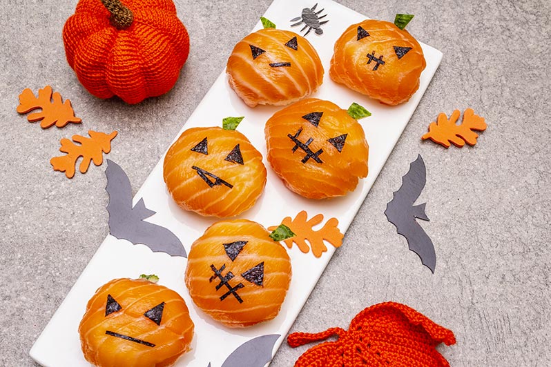 El sushi casero nunca fue tan aterrador: bolitas de arroz cubiertas con salmón (podemos usar salmón marinado o ahumado) decorado con ojos y bocas recortados en alga nori.