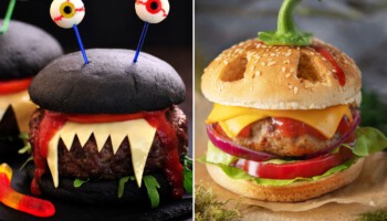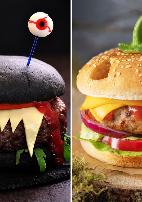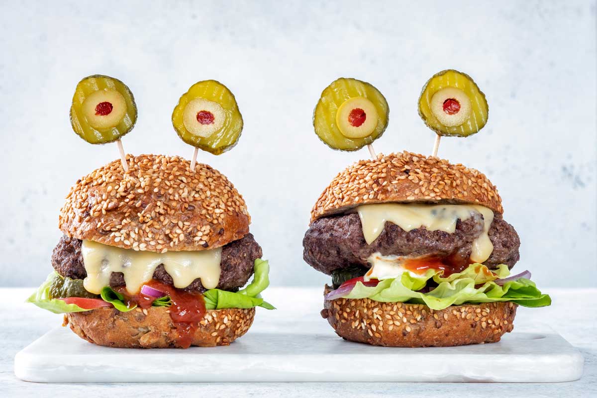 ¿Qué te parecen estas hamburguesas de Halloween? Unas ricas hamburguesas caseras son el mejor bocadillo de Halloween, solo tenemos que cortar una loncha de queso en picos y ponerla de manera que salga hacia afuera del bocadillo para que parezcan los dientes del monstruo. Un poco de ketchup chorreando y unos ojos hechos con rebanadas de aceitunas rellenas, nada más.