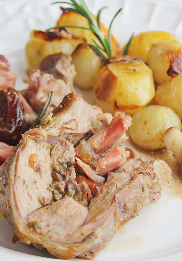 Este cordero al horno relleno lleva dátiles y jamón, y la preparamos con una patatas baby, por lo que también tendremos lista la guarnición.