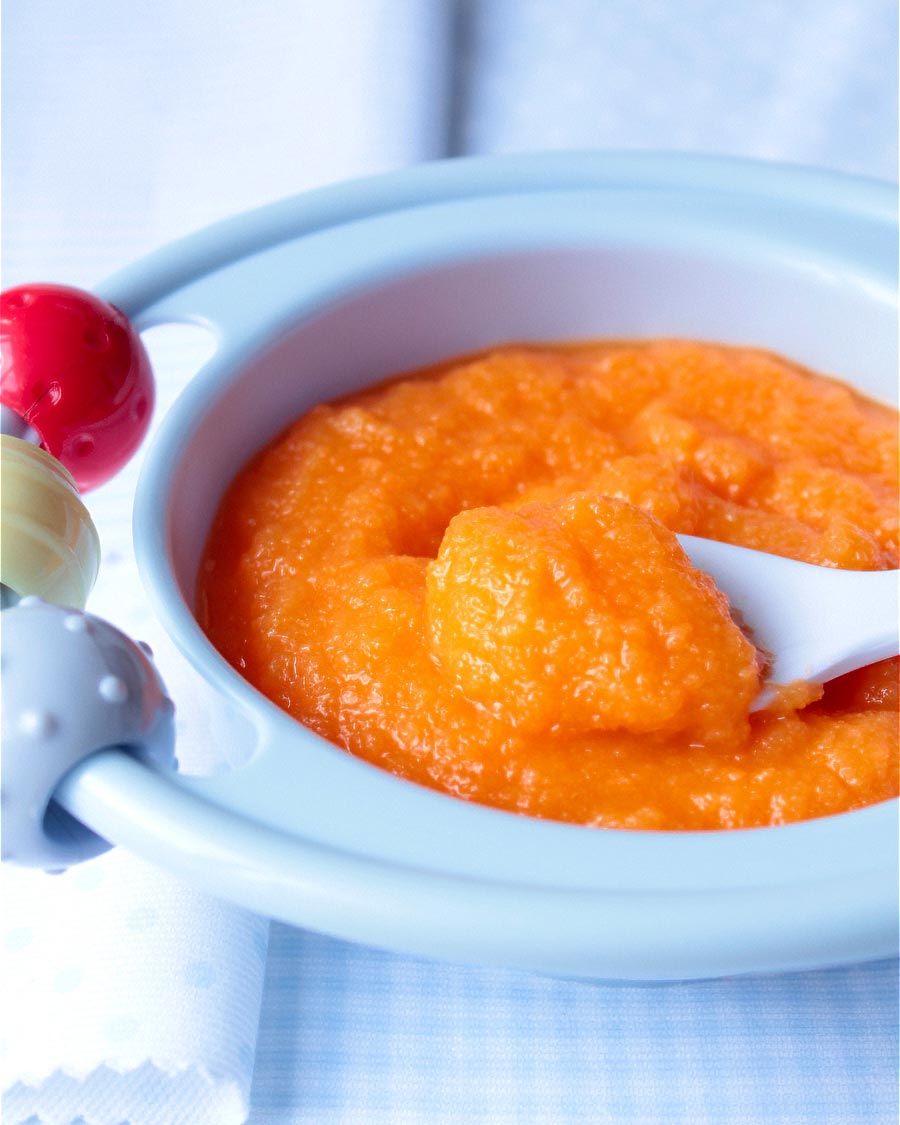- Integra proteínas poco a poco: Si tu pediatra lo recomienda, puedes incorporar pequeñas cantidades de pollo, pescado blanco o legumbres suaves cocidas al puré de zanahoria.