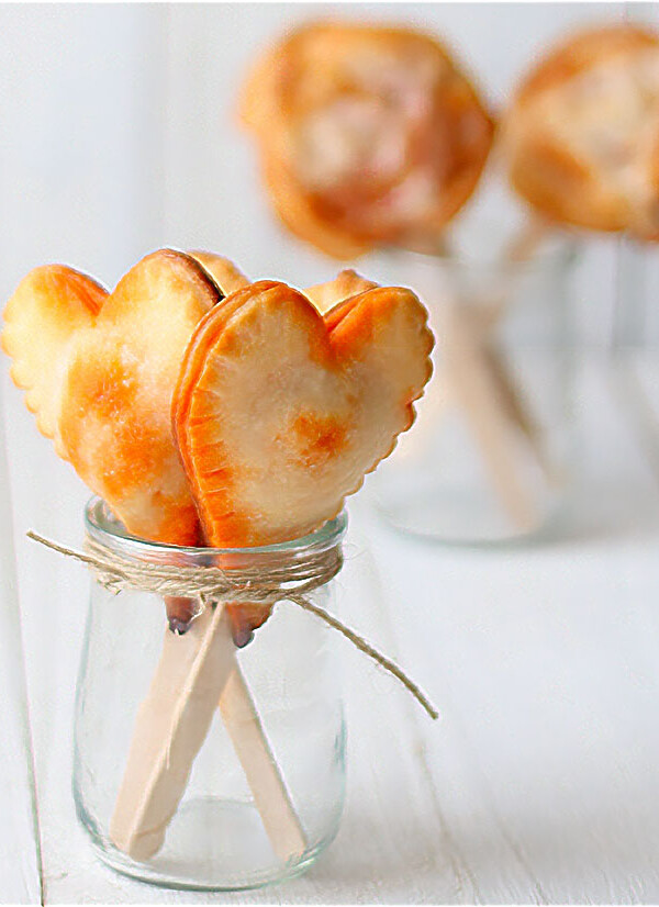 - Para empezar, ¿qué tal unos aperitivos en piruleta? Se trata de unos delicados aperitivos de hojaldre rellenos. En la receta veréis que nosotros hemos elegido preparar un surtido de salmón ahumado, queso crema y rúcula, foie y cebolla caramelizada, y sobrasada con miel, pero vosotros podéis optar por el relleno que más os tiente.