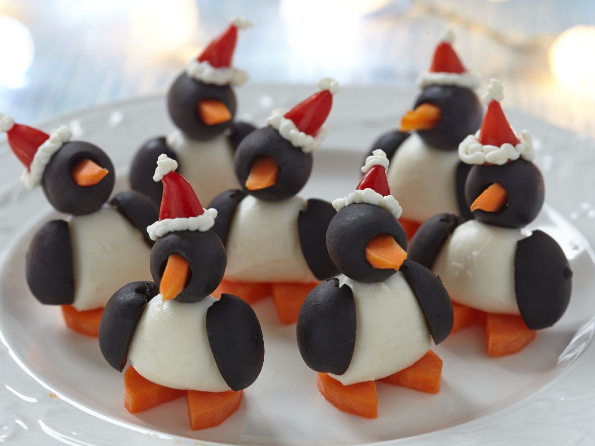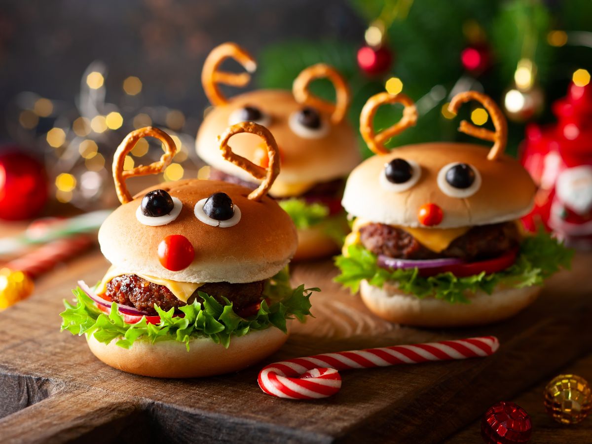 - De plato principal, unas divertidas hamburguesas navideñas, decoradas como los renos de Papá Noel. Para hacerlas solo tienes que poner pretzel cortados por la mitad como cuernos, unas aceitunas con queso para los ojos, y medio tomate cherry para la nariz. En cuanto a la hamburguesa casera, sigue nuestra receta abajo.