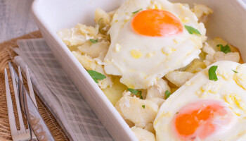 Otra buena idea para lograr que toda la familia coma al menos 2 veces a la semana pescado es preparar unas buenas patatas coronadas con huevo y bacalao. ¡Una bomba!