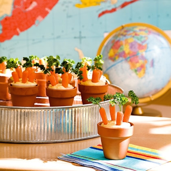 ¡Mirad que modo divertido de presentar el hummus! Entre las recetas divertidas con zanahorias que encontramos en Pequeocio estaban estas macetas de hummus con zanahorias baby que son un verdadero encanto.