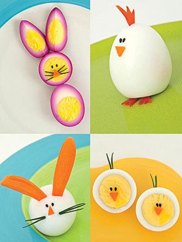 En Pequeocio hemos encontrado muchas recetas con huevo para Pascua y me han gustado estas que vemos en la imagen porque son muy sencillas, no necesitan mayores explicaciones. Para darle color al huevo duro podemos hervirlo poniendo colorantes alimentarios en el agua o si preferís algo más natural, hervirlos en el agua de cocción de una remolacha.