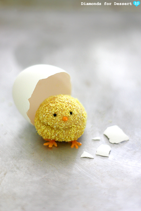 La receta original (enlace debajo de la imagen, en inglés) es de galletas, pero a mí se me ha ocurrido que estas trufas de coco que aprendimos a preparar hace un tiempo también quedarían perfectas. En vez de cubrirlas con granillos de azúcar como hemos hecho aquella vez, las cubriremos con coco teñido (ponemos el coco dentro de un cuenco, echamos unas gotas de colorante alimentario amarillo y mezclamos con los dedos). Los ojitos y las patas están hechos con glaseado o candy melts.