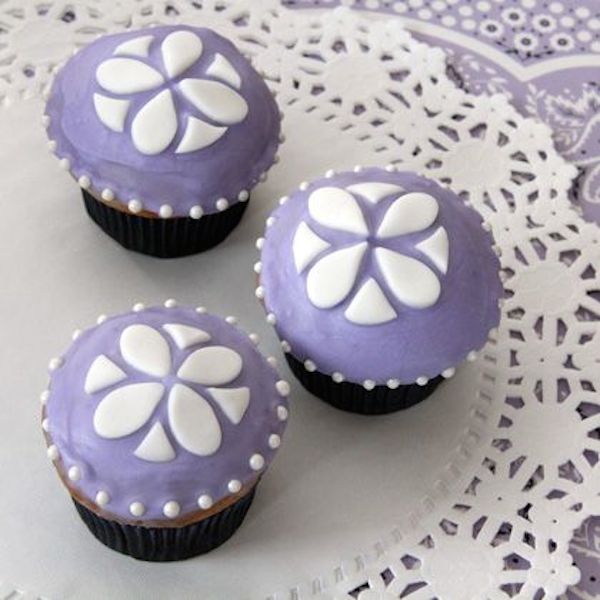 Estos cupcakes son perfectos para una fiesta infantil inspirada en la princesa Sofía. Podéis usar la receta de cupcakes del monstruo de las galletas que os dejamos hace un tiempo, sólo que en vez de teñir la buttercream de azul, lo haréis de morado. Untamos las magdalenas con la buttercream morada, usando una espátula pequeña y luego los decoramos con fondant blanco, haciendo el símbolo de Sofía: una flor de cuatro pétalos con triángulos pequeños entre pétalo y pétalo.