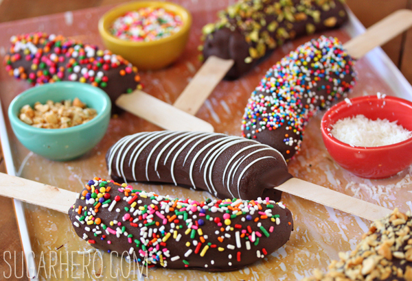 Los plátanos y el chocolate se llevan de mil maravillas y si además tienen forma de piruleta, ¡el éxito está asegurado! Es suficiente cortar a la mitad los plátanos, pincharlos en un palito de helado y bañarlos con chocolate de cobertura. Antes de que se seque podemos espolvorearlos con fideos de azúcar, frutos secos triturados, coco, etc.