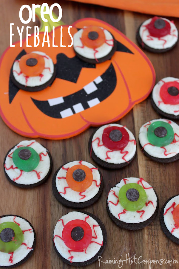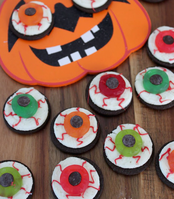 Para una merienda rápida y aterradora, sólo necesitamos galletas Oreo, gominolas redondas, gotas de chocolate y un poco de glaseado o candy melts rojo (podéis comprar aquí).