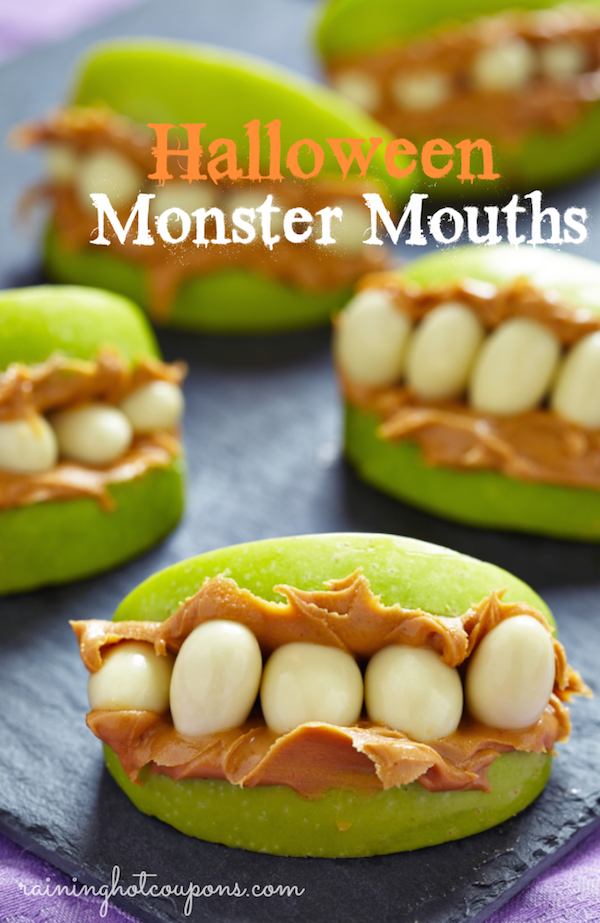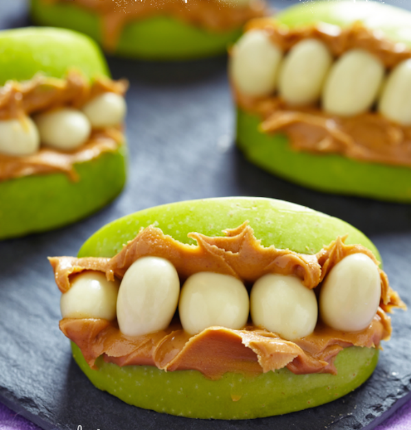 ¡Qué postre tan divertido! Con dos gajos de manzana, unas peladillas de almendra (puedes comprar aquí) y un poco de mantequilla de cacahuete o dulce de leche podemos hacer una merienda para Halloween deliciosa, fácil… ¡y terrorífica!
