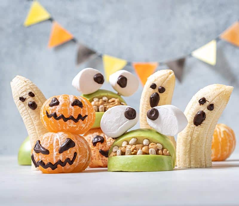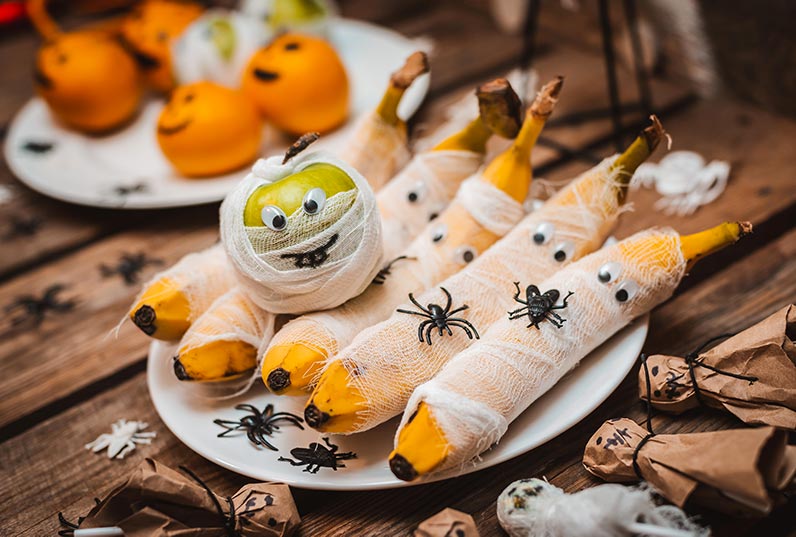 Si lo quieres hacer aún más fácil solo tienes que envolver la fruta de la merienda de Halloween con un poco de gasa, pegar unos ojos de manualidades y saltear algunas arañas, ¿no es divertido?