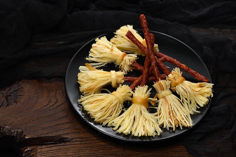 También las brujas tienen su lugar en Halloween y por supuesto vienen con sus escobas. Un palito de pretzel, una loncha de queso con flecos cortados en el borde enroscada alrededor del palito, y sujeta con otro hilo de queso. ¡Ha quedado perfecta!