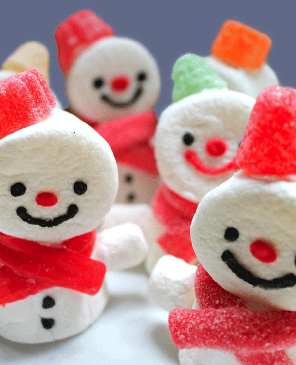 Para hacer estos muñecos de nieve de chuches usaremos el glaseado para pegar las piezas, como en el primer ejemplo que os hemos dado. Dos nubes grandes serán el cuerpo y dos pequeñas los brazos, una gominola nos servirá como sombrero y una tirita de regaliz o gominola será la bufanda. Para hacer la cara podéis usar rotuladores comestibles para decorar como éstos.