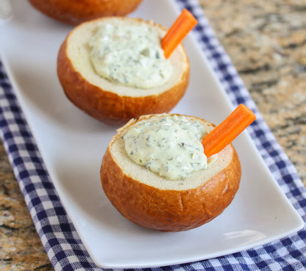 Por último, podemos usar las cazuelas de pan para presentar los dips en los aperitivos. Es un modo muy original de hacerlo, y además con la miga de pan que retiramos podemos cortar cubitos y tostarlos para acompañar los patés o dips.