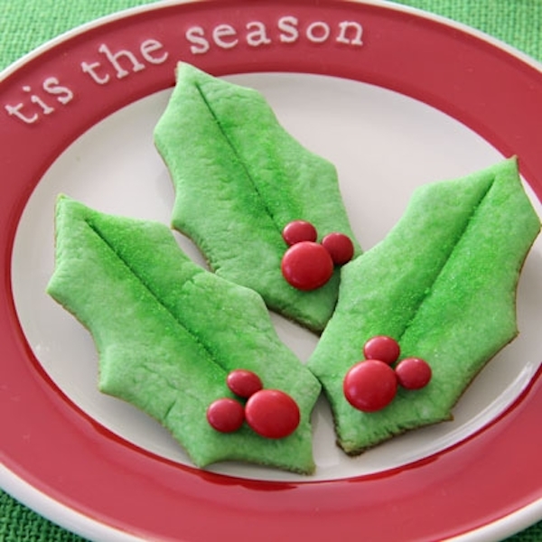 Con la misma masa teñida de verde y un cortante para galletas con forma de hoja de muérdago ya tenemos todo el trabajo hecho. Una vez que las galletas estén frías les pegamos unos Lacasitos rojos con un poco de glaseado o chocolate de cobertura y ya tenemos listas las galletas.