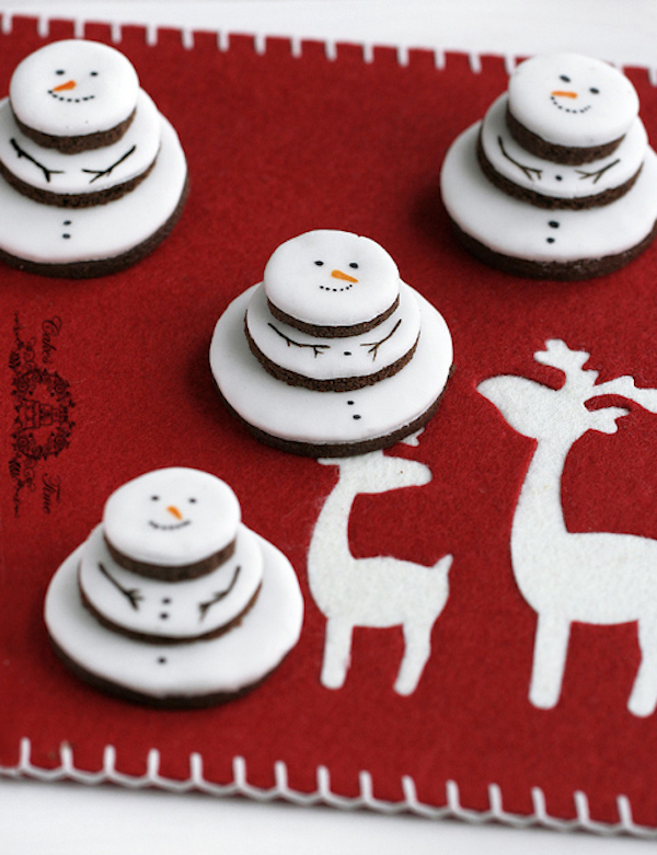 Si preparáis unas galletas de chocolate decorarlas de esta manera tan original, os resultará sencillo. Preparamos las galletas en tres medidas diferentes y las horneamos siguiendo la receta. Cuando estén frías, con los mismos cortadores de galletas cortamos los círculos de fondant blanco estirado bien fino, y los pegamos con un poco de agua a cada galleta. Con un punto de glaseado o chocolate de cobertura pegamos una galleta encima de otra y cuando el fondant se haya endurecido, con rotuladores alimenticios dibujamos los detalles de los muñecos.