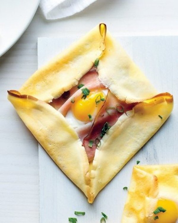 ¡Vaya pinta tienen estos crepes! Preparamos los crepes necesarios y los vamos poniendo sobre una fuente de horno, con una o dos lonchas de jamón york por encima. En una sartén ponemos a freír un huevo por comensal, pero los retiramos apenas la clara se pone un poco blanca y los podemos levantar con la espátula sin que se desparramen; este paso sólo sirve para poder poner el huevo en el centro de los crepes y doblar los bordes, ya que si lo hacemos con el huevo crudo se escaparía por todos lados. Llevamos al horno a 200° hasta que el huevo esté cocido y servimos espolvoreando con un poco de cebollín picado.