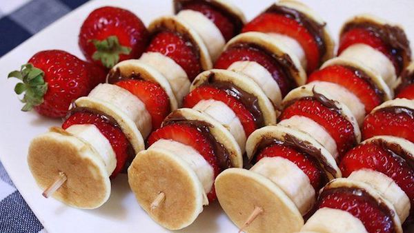 Ya os hemos enseñado a preparar las tortitas americanas, podéis preparar esta variante divertida haciendo tortitas pequeñas y untándolas con Nocilla, para luego ir pinchándolas en un palillo de brocheta con rodajas de plátano y trozos de fresa. ¡Un desayuno o merienda realmente delicioso!