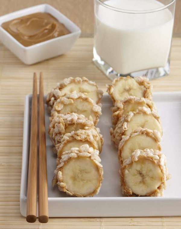Para jugar un rato con los niños podéis presentarles el plátano como si fuera sushi, para comerlo con palitos. Para ello lo untáis con dulce de leche o algo similar, lo pasáis por corn flakes, arroz inflado u otra cosa crujiente y lo cortáis en rodajas.