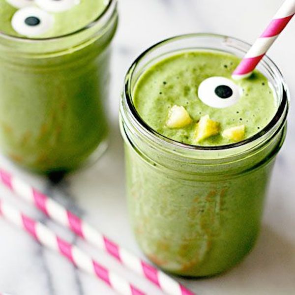 ¿Y si en vez de comernos un monstruo nos lo bebemos? Prepara un delicioso batido verde para convertirlo en un brebaje monstruoso, con sólo agregar arriba algunos detalles, que podemos hacer con diferentes ingredientes, dependiendo del sabor de la bebida. Yo te propongo esta por ejemplo: