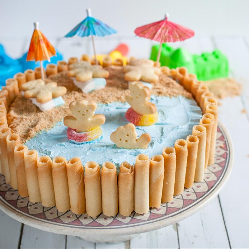Esta tarta de cumpleaños infantil es una de nuestras favoritas, y es mucho más fácil de preparar de lo que parece. Comienza con la base de bizcocho que prefieras y rellénala con la crema que más te guste. Luego, cubre una parte de la tarta con buttercream teñido de azul para simular el mar, y otra parte con galletas trituradas para imitar la arena de la playa. Rodea todo el contorno de la tarta con barquillos para darle un toque especial. Finalmente, coloca galletas en forma de ositos en diferentes posiciones sobre gominolas, simulando una divertida escena en la playa. Para completar el conjunto, añade unas sombrillas decorativas que aportarán el toque final perfecto. Aquí te la explicamos paso a paso con imágenes del proceso: