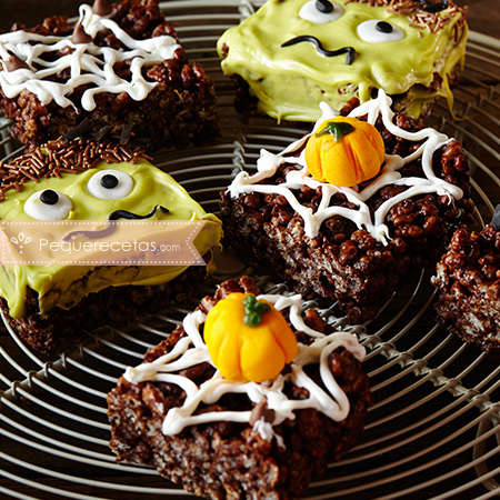 ¿Sabes qué llevan estos monstruos? Arroz inflado, chocolate, malvaviscos y poco más. ¿A qué están bonitos? Y os aseguramos que están súper deliciosos.