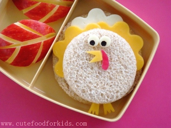 Podemos darle al pan la forma que necesitemos para crear nuestro personaje, por ejemplo cortarlo en círculo, uno más grande y uno más pequeño y utilizar las lonchas de queso para hacer la cola del pavo. Siempre con queso cortaremos el pico, las patas y los ojos, a los que les pondremos un trocito de oliva negra en el centro. La cresta está hecha con un trocito de rábano.