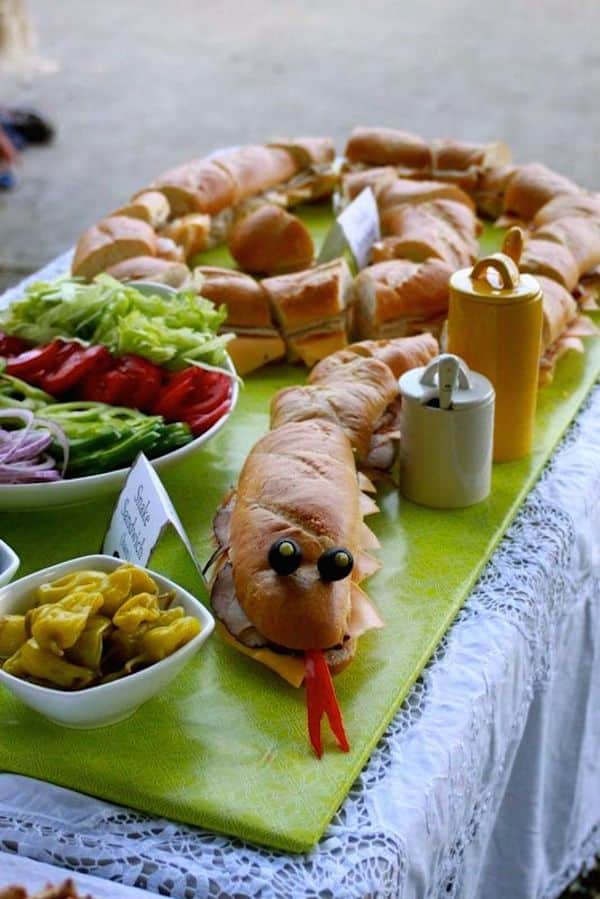 Unas baguettes se pueden transformar en una serpiente perfecta para una fiesta infantil: podemos cortarla en trozos para darle la forma a la serpiente y para que los peques puedan coger cada uno su bocadillo. Los ojos son olivas rellenas y la lengua está hecha con pimiento rojo.