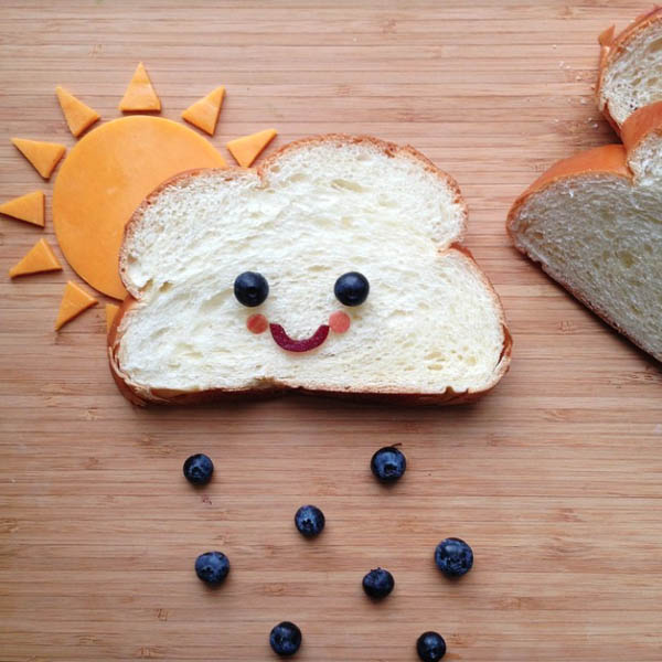 Hay algunos panes, como por ejemplo el pan de molde, que son bien blanditos y tienen un forma algo curva en la superficie, que nos puede venir muy bien para hacer un sencillo sándwich en forma de nube. Podéis rellenarlo con mermelada o Nocilla y hacer la carita con arándanos, o un poco de mermelada. Si queréis hacer vuestro propio pan, no os perdáis nuestras 14 recetas de pan casero.