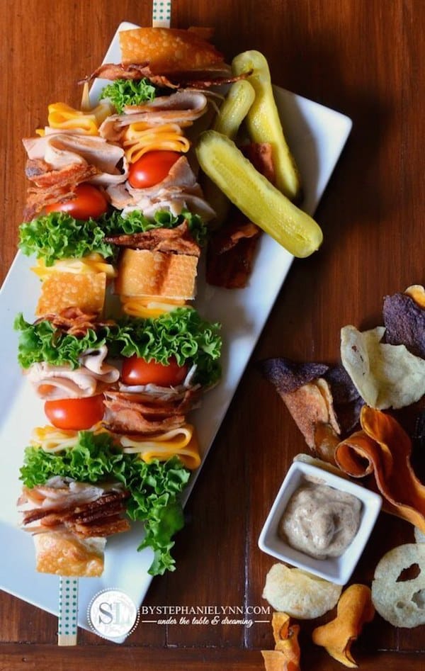 También podemos cambiar totalmente la forma tradicional de nuestro sándwich y cortar el pan y los ingredientes en trocitos, pinchándolos en un palillo de brocheta. Es una idea muy divertida para fiestas y se me ocurre que acompañados por alguna salsita especial, ¡estarán de muerte!