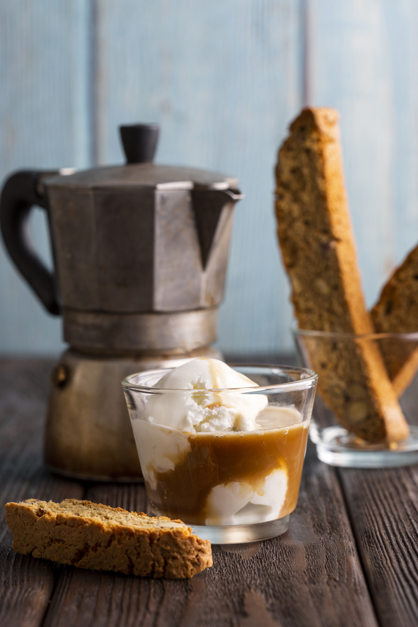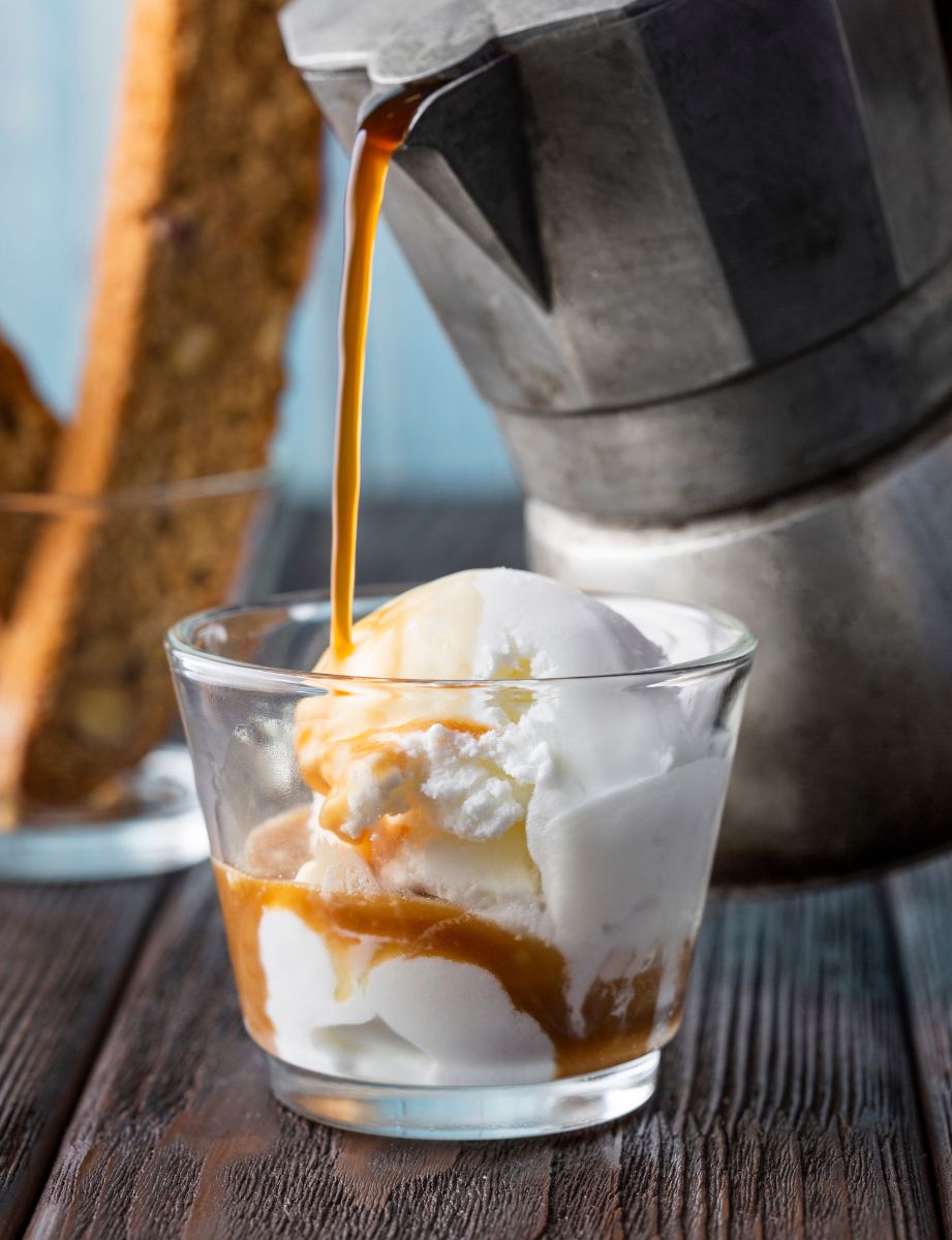 - Prepara 1 o 2 shots de café expreso recién hecho (30-60 ml) y viértelo directamente sobre el helado para que la crema quede encima.