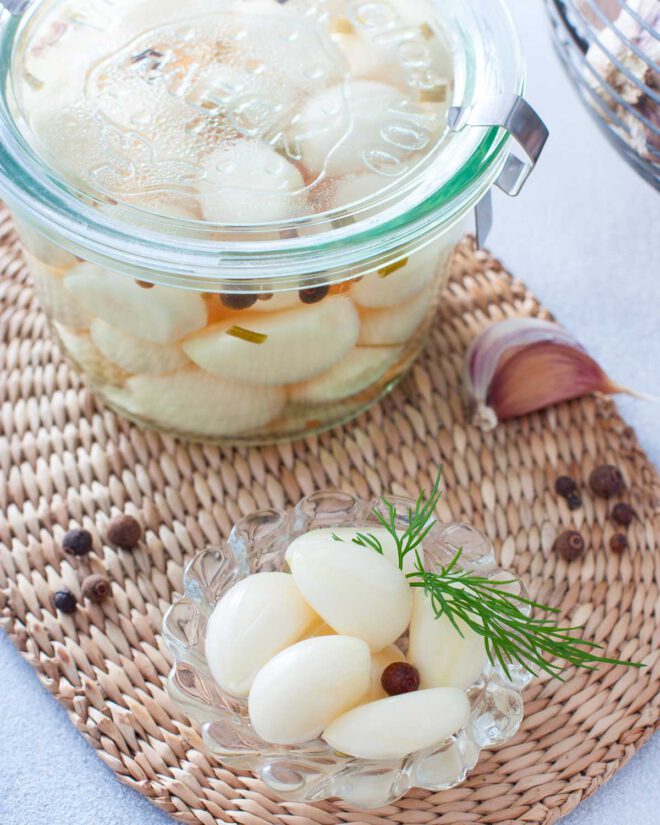 Los ajos encurtidos, igual que otro tipo de verduras como las zanahorias, pepinillos, o cebollas encurtidas, se preparan con vinagre y especias, que permiten conservarlos en perfectas condiciones durante mucho tiempo bien guardados en frascos de cristal.