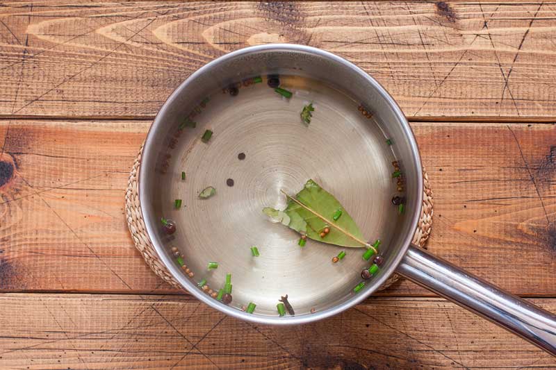 - Ponemos todos los ingredientes en un cazo: el vinagre, el agua, la sal, el azúcar, el laurel y las especias.