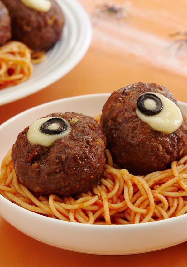 ¿Qué os parece si transformamos las albóndigas en unos ojos alocados? Seguro que a los niños les encantarán. Es sólo cuestión de llevar las albóndigas ya cocidas unos minutos al horno con un circulito de queso y una rodaja de oliva negra encima, el tiempo necesario para que el queso se derrita, y ya luego podemos servir las albóndigas como teníamos previsto hacerlo.