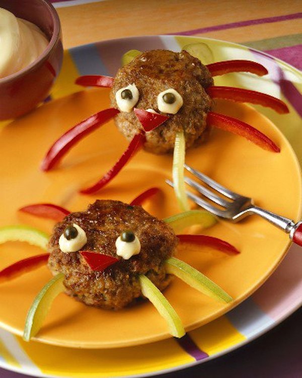 Unas ricas albóndigas al horno pueden ser además muy divertidas, si las transformamos en arañas. Usad los ingredientes que tengáis en casa para hacer los detalles, como pimientos, mayonesa, granos de pimienta o trocitos de olivas negras… lo que se os ocurra que os puede servir para hacer las patas, los ojos y la nariz.