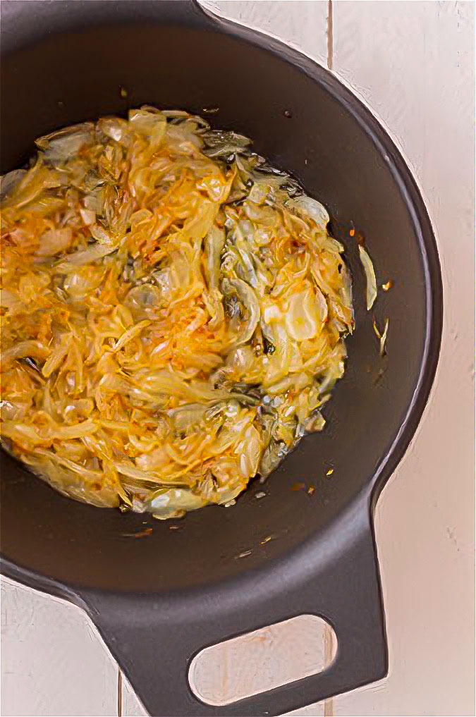 - Picamos la cebolla bien fina y añadimos a la olla, cuando el ajo empiece a dorarse.