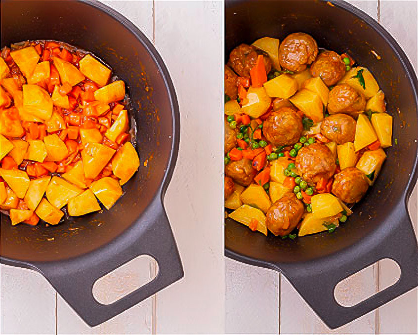 - Cocinamos durante un par de minutos y añadimos las albóndigas que tenemos reservadas.