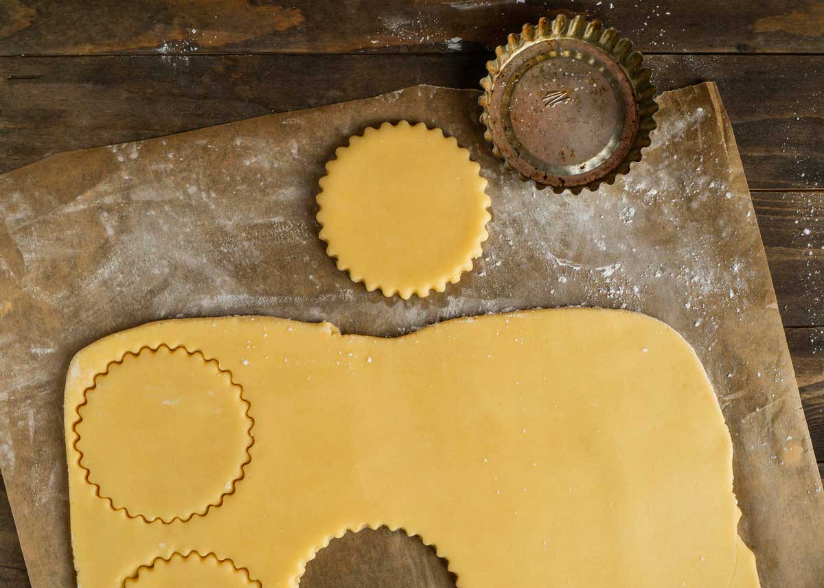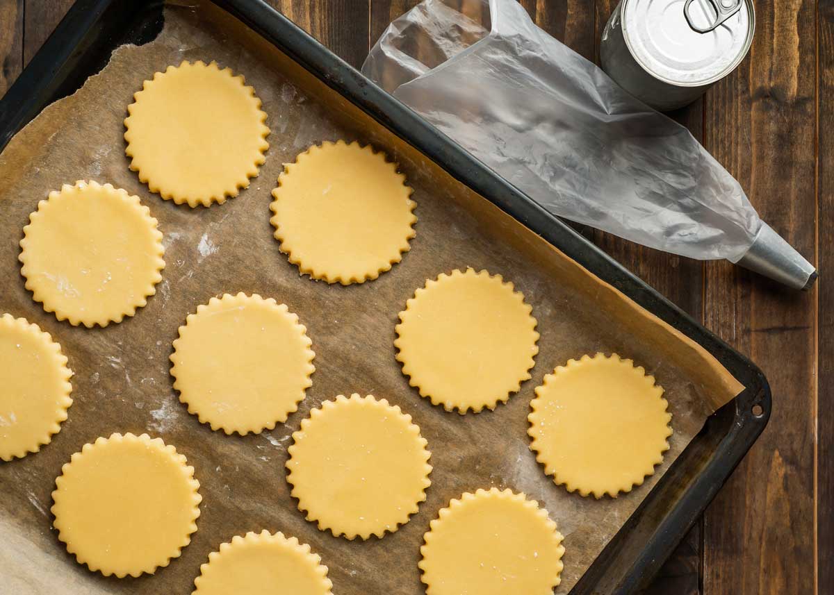 - Cortamos círculos de unos 3,5 cm de diámetro y los disponemos en una fuente para horno cubierta con una lámina de papel de hornear o de silicona, un poco separados entre ellos. Los recortes de masa que nos van quedando los volvemos a amasar para hacer nuevas galletas.