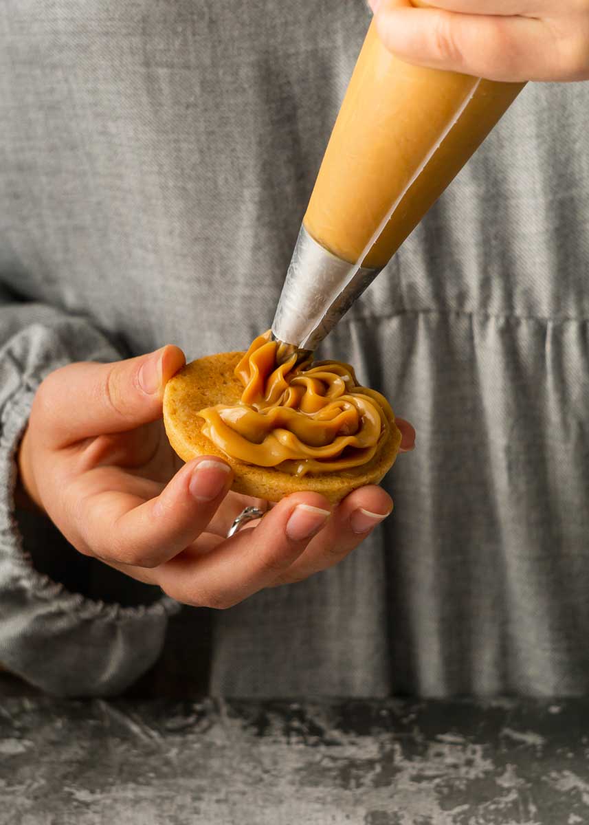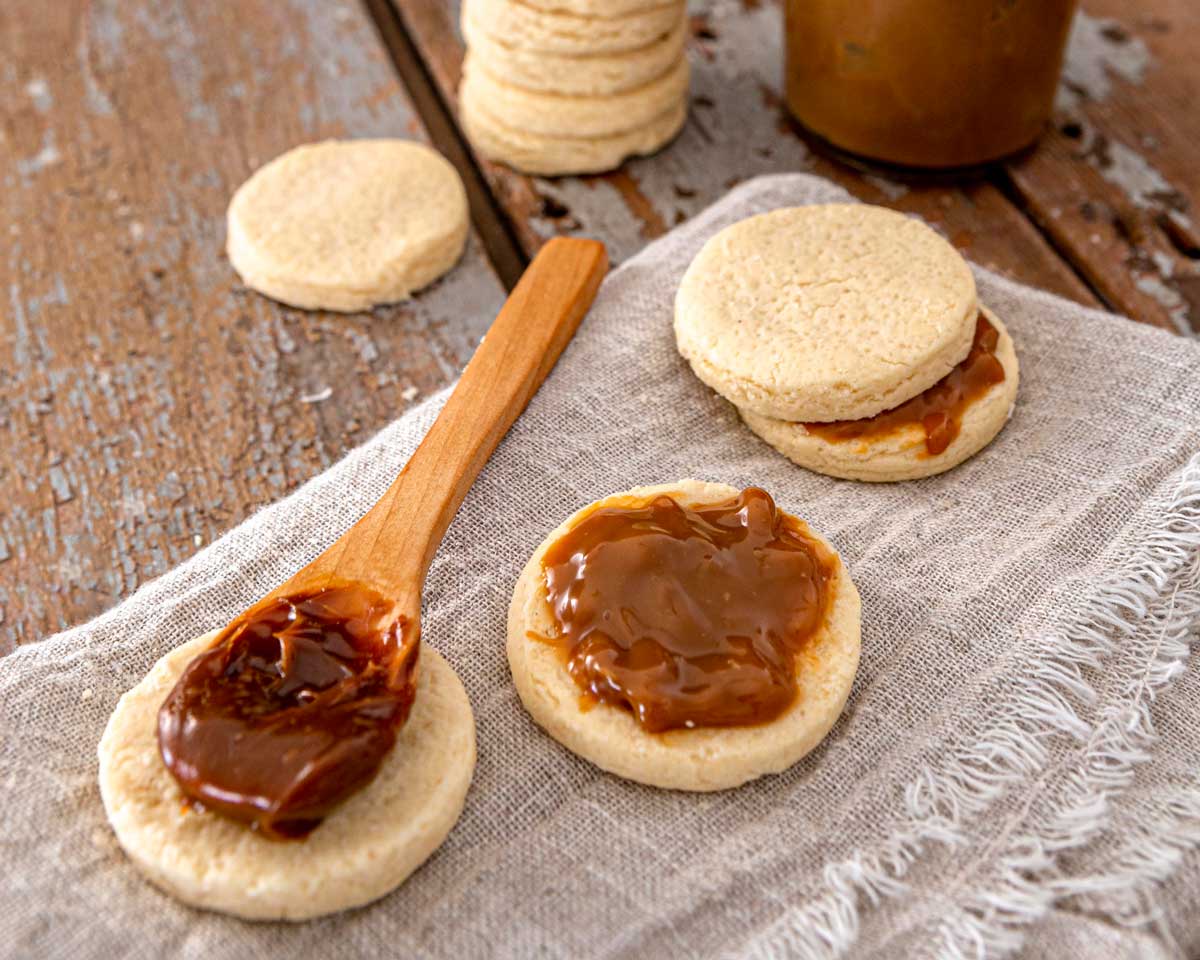 - Vamos armando los alfajores uniendo dos galletas con una buena cucharada de dulce de leche. En este paso tenemos que ser cuidadosos porque las galletas son muy quebradizas.