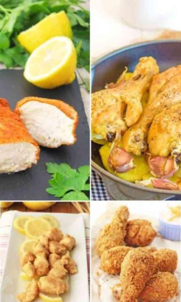 kimberly,esta receta está muy rica.pollo troceado en una cazuela, con abundante aceite de oliva,casi que lo cubra.y con muchos dientes de ajo sin pelar (una cabeza). a fuego muy lento. osea( pollo confitado).espero que te guste.
