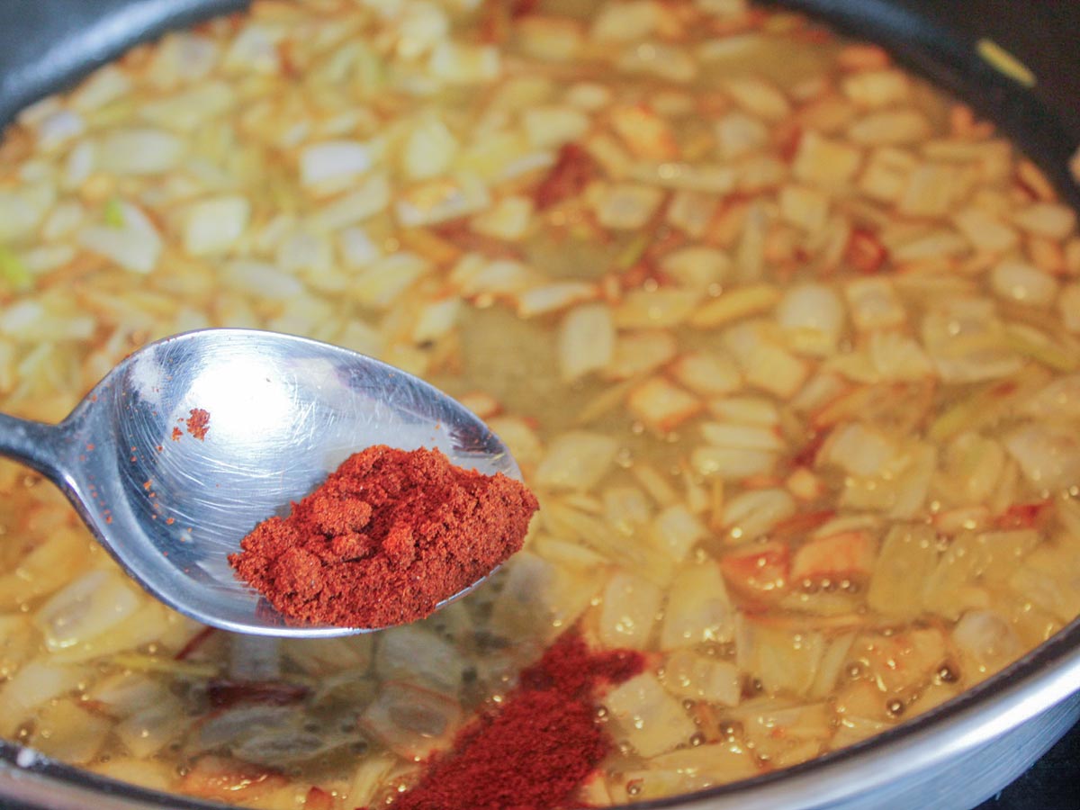 Apartamos la sartén unos segundos del fuego e incorporamos el pimentón dulce y mezclamos.