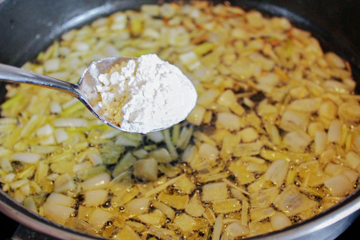 Cuando comiencen a dorarse añadimos la harina que cocinamos removiendo.
