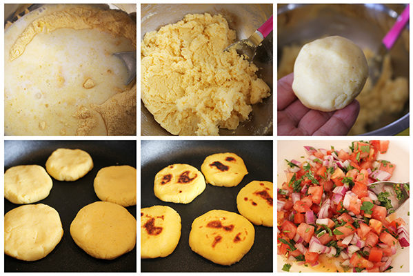 - Para preparar las arepas ponemos la harina en un recipiente, añadimos la sal, la mantequilla que debe estar muy blanda, la leche y el agua, templadas, y mezclamos muy bien, primero con la ayuda de una cuchara y después con las manos.