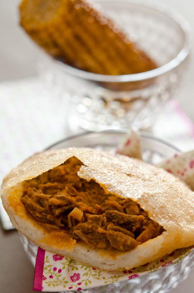 Un relleno muy típico de las arepas es la carne mechada, que suele prepararse con carne hervida con verduras y luego guisada con un sofrito de cebolla y tomate. Sirve cualquier carne guisada en salsa, muy tierna, desmenuzada -esto es importante-, y mezclada con un poco de la salsa batida.