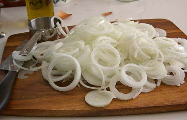 - Pelamos la cebolla y cortamos en rodajas o aros