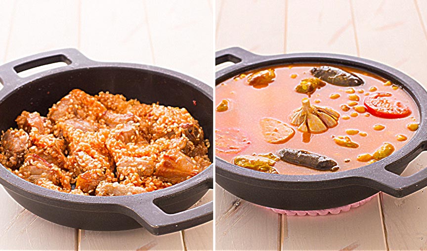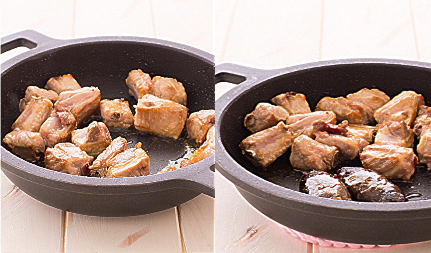 Nosotros en esta ocasión hemos utilizado costillas de cerdo troceadas y morcilla de cebolla, pero también es habitual utilizar panceta fresca.