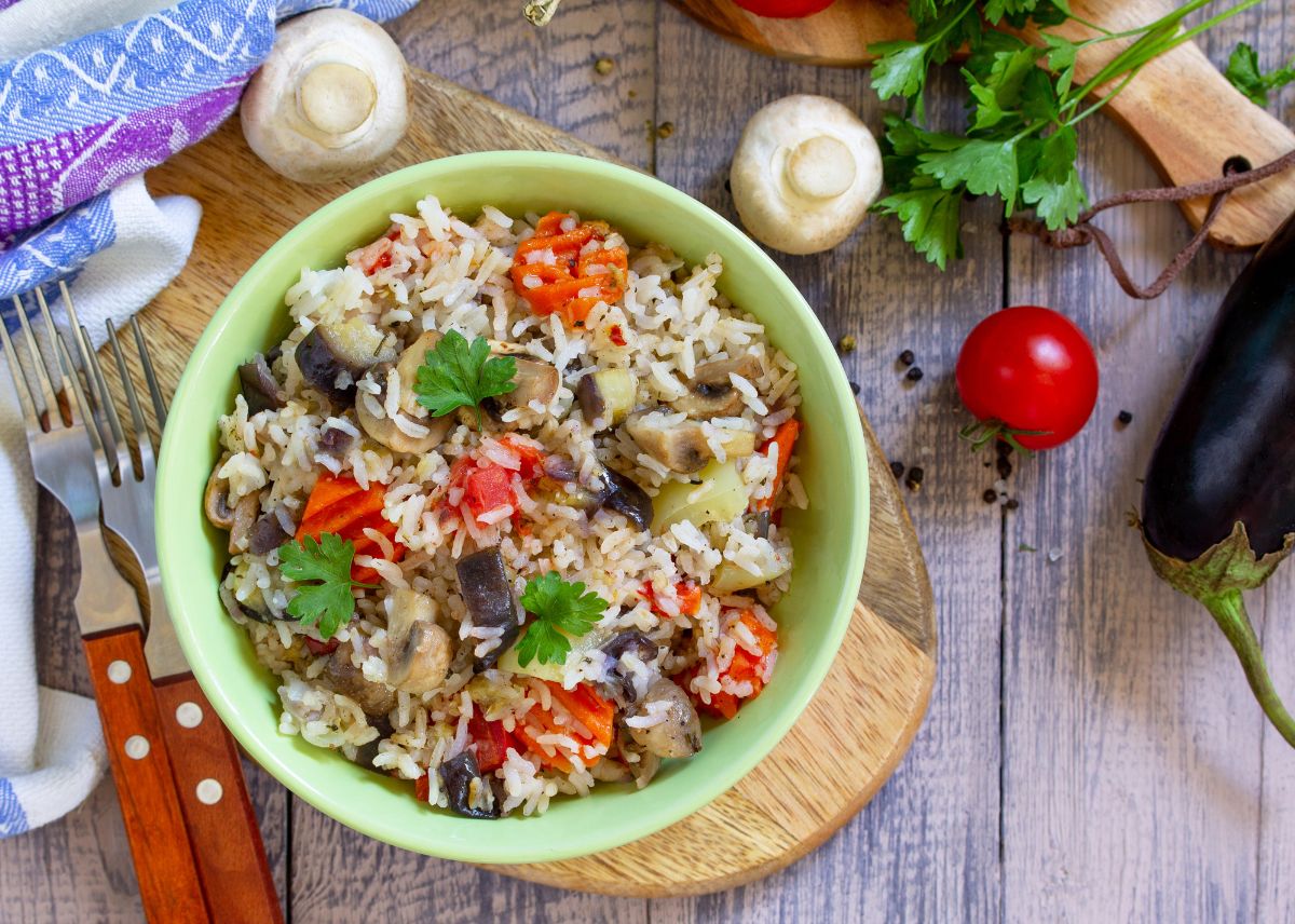 El arroz basmati, con su distintivo aroma y grano largo, se convierte en la base perfecta para combinarlo con verduras, en este caso hemos elegido berenjena, pimiento, tomate y champiñones, pero puedes elegir las que sean más de tu agrado: espárragos verdes, brócoli, calabacín…